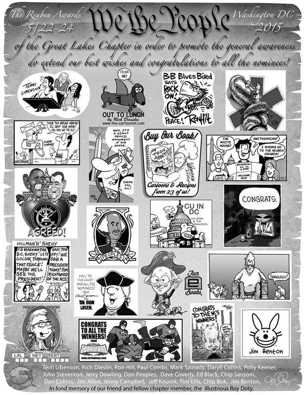 The Reuben Journal ad for our Great Lakes Chapter of the National Cartoonist Society is finished! This is the fourth one I've put together for the gang and it was a pretty smooth task this time. A few stragglers as always ( cartoonists are notorious procrastinators ) but we're done and ahead of schedule! The Journal is a publication for the Reuben Awards weekend, which will be held in Washington DC on Memorial Day weekend. A fun time for all concerned, nominated or not. Thanks to my cartooning bros and sisses for trusting me with the job of representing the chapter. Hope you like it. — Dan Collins